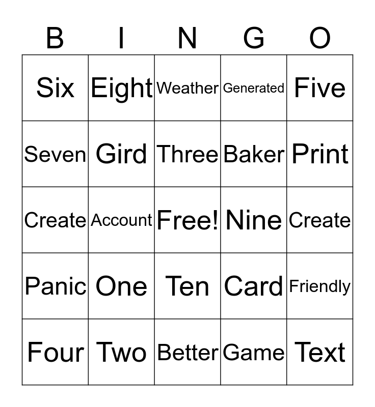 This bingo card has a free space and 24 words: One, Two, Three, Four, Five, Six, Seven, Eight, Nine, Ten, Baker, Create, Card, Friendly, Gird, Game, Create, Weather, Print, Account, Text, Panic, Generated and Better.