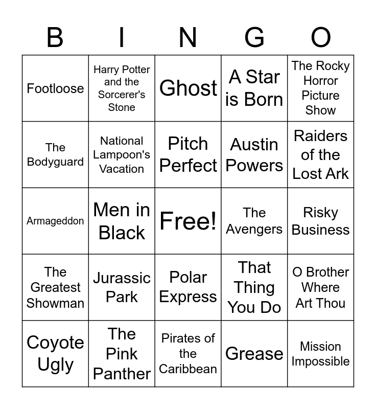 This bingo card has a free space and 50 words: Rocky IV, Mission Impossible, Top Gun, Pirates of the Caribbean, Jurassic Park, Where the Crawdad Sings, Harry Potter and the Sorcerer's Stone, Robin Hood, The Bodyguard, Ghostbusters, National Lampoon's Vacation, A Star is Born, O Brother Where Art Thou, That Thing You Do, Purple Rain, Trolls, Pitch Perfect, The Avengers, Moulin Rouge, The Rocky Horror Picture Show, Men in Black, Grease, Footloose, Austin Powers, Schindler's List, Toy Story, Raiders of the Lost Ark, Jaws, Ghost, Polar Express, 9 to 5, 8 Mile, Dirty Dancing, Twilight, The Pink Panther, Flashdance, Encanto, Titanic, Shrek, Risky Business, Psycho, Breakfast Club, Frozen, Soul, Coyote Ugly, Armageddon, Wizard of Oz, Superman, The Greatest Showman and Star Wars.