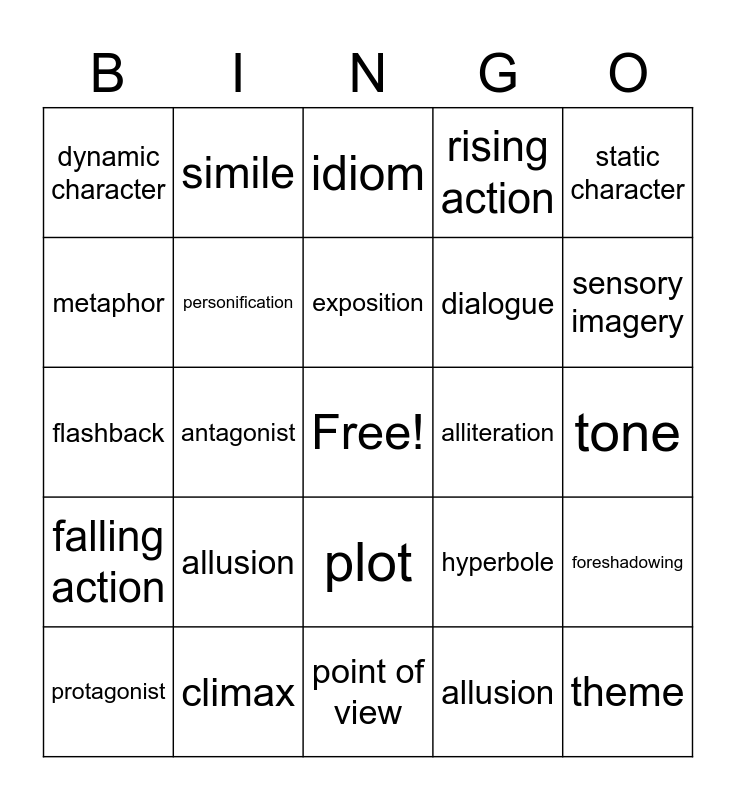 This bingo card has a free space and 26 words: plot, allusion, exposition, climax, static character, dynamic character, metaphor, simile, tone, hyperbole, dialogue, flashback, foreshadowing, protagonist, antagonist, symbol, rising action, falling action, idiom, theme, sensory imagery, point of view, alliteration, allusion, personification and exposition.