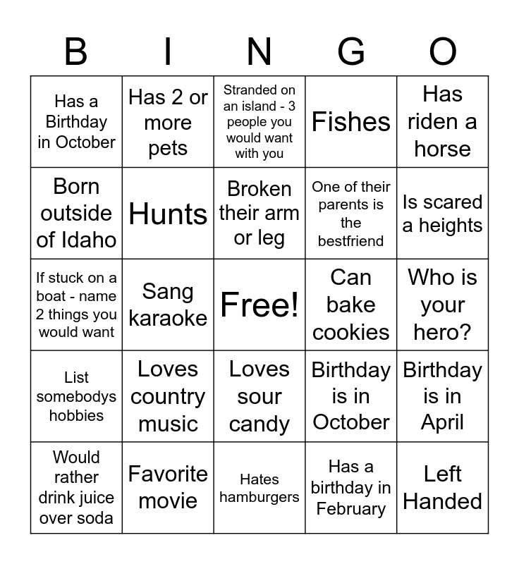 This bingo card has a free space and 46 words: Has blue eyes, Left Handed, Size 10 shoe, Hates hamburgers, Loves country music, Has 3 siblings, Has 2 or more pets, Has brown eyes, Born outside of Idaho, Traveled to more than 10 states, Hunts, Fishes, Birthday is in April, Birthday is in October, Loves to eat seafood, Has had surgery, Broken their arm or leg, Can bake cookies, Has a sister, Has riden a horse, Sang karaoke, Has a birthday in February, Has a Birthday in October, One of their parents is the bestfriend, Went to the same elemetary school as me, Is scared a heights, Would rather drink juice over soda, Hates winter, Loves sour candy, List somebodys hobbies, List someboys pet peeves, Has the same birth month, Favorite animal at the zoo, Somebody with the same color of eyes: If they won the lottery..., What is the worst gift you have received?, Favorite movie, Who is your hero?, Celebrity crush?, Last song you listened to?, Least favorite Christmas song?, Who knows you best?, Stranded on an island - 3 people you would want with you, If stuck on a boat - name 2 things you would want, Sweet or salty snacks?, Would you rather have your grandma's name or her hair? and Would you rarther have your grandpa's name ir his driving skills?.