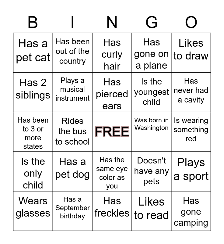 This bingo card has a free space and 24 words: Has a pet dog, Has a September birthday, Has pierced ears, Wears glasses, Likes to draw, Has a pet cat, Has 2 siblings, Has been out of the country, Was born in Washington, Has the same eye color as you, Is the youngest child, Has been to 3 or more states, Doesn't have any pets, Plays a sport, Plays a musical instrument, Likes to read, Is wearing something red, Has curly hair, Has never had a cavity, Rides the bus to school, Has gone camping, Is the only child, Has gone on a plane and Has freckles.
