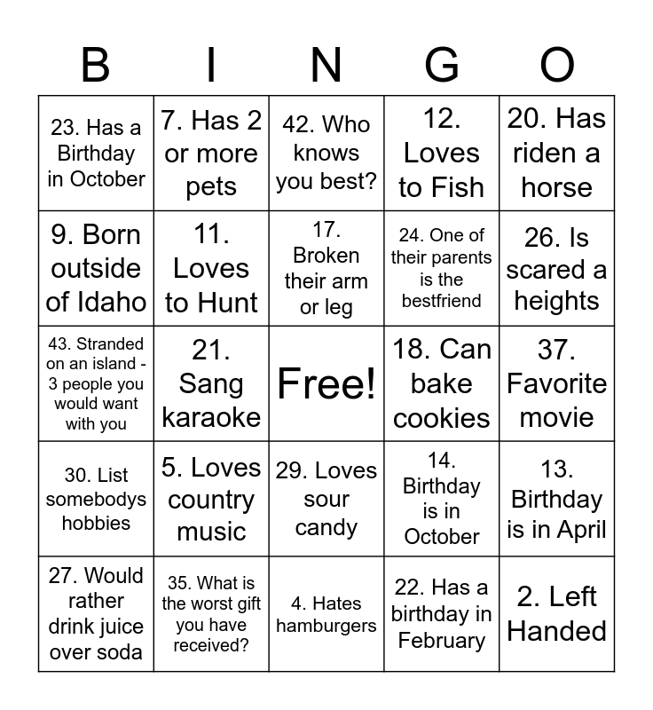 This bingo card has a free space and 47 words: 1. Has blue eyes, 2. Left Handed, 3. Size 10 shoe, 4. Hates hamburgers, 5. Loves country music, 6. Has 3 siblings, 7. Has 2 or more pets, 8. Has brown eyes, 9. Born outside of Idaho, 10. Traveled to more than 10 states, 11. Loves to Hunt, 12. Loves to Fish, 13. Birthday is in April, 14. Birthday is in October, 15. Loves to eat seafood, 16. Has had surgery, 17. Broken their arm or leg, 18. Can bake cookies, 19. Has a sister, 20. Has riden a horse, 21. Sang karaoke, 22. Has a birthday in February, 23. Has a Birthday in October, 24. One of their parents is the bestfriend, 25. Went to the same elemetary school as me, 26. Is scared a heights, 27. Would rather drink juice over soda, 28. Hates winter, 29. Loves sour candy, 30. List somebodys hobbies, 31. List someboys pet peeves, 32. Has the same birth month, 33. Favorite animal at the zoo, 34. Somebody with the same color of eyes:, 36. If they won the lottery..., 35. What is the worst gift you have received?, 37. Favorite movie, 38. Who is your hero?, 39. Celebrity crush?, 40. Last song you listened to?, 41. Least favorite Christmas song?, 42. Who knows you best?, 43. Stranded on an island - 3 people you would want with you, 44. If stuck on a boat - name 2 things you would want, 45. Sweet or salty snacks?, 46. Would you rather have your grandma's name or her hair? and 47. Would you rarther have your grandpa's name or his driving skills?.