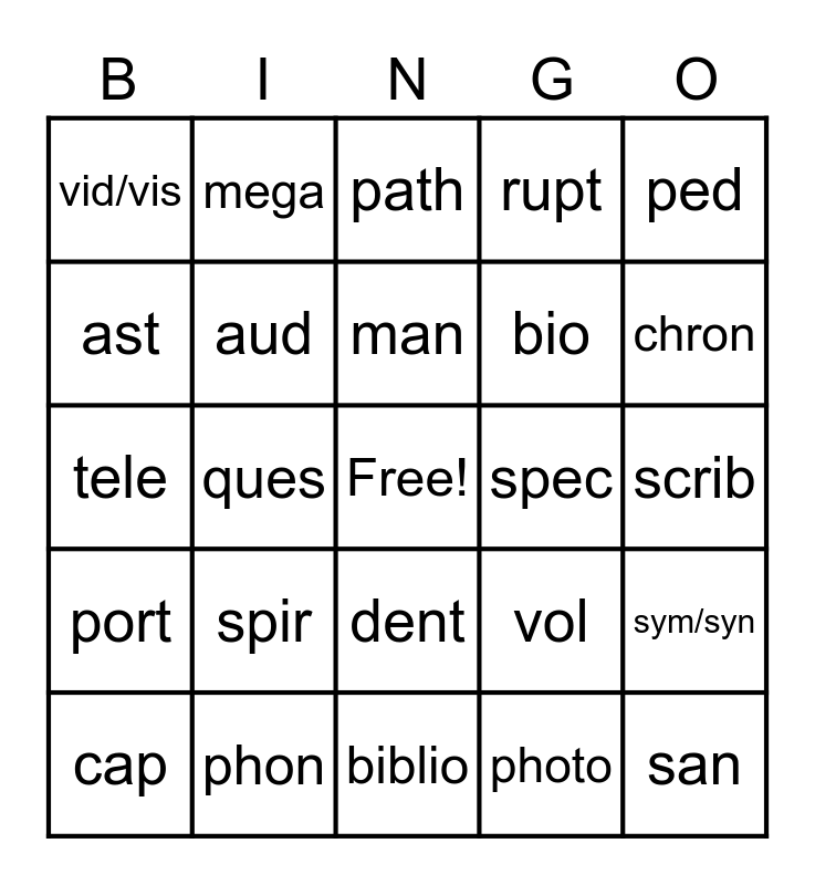This bingo card has a free space and 39 words: act, anim, aqua, aud, cap, dent, man, mot/mov, ped, port, ques, rupt, san, scrib, spec, spir, tain/ten, vid/vis, voc, vol, ast, biblio, bio, chron, cycle, gram, graph, hydr, mechan, mega, meter, oid, path, phon, photo, scop, sym/syn, tele and therm.