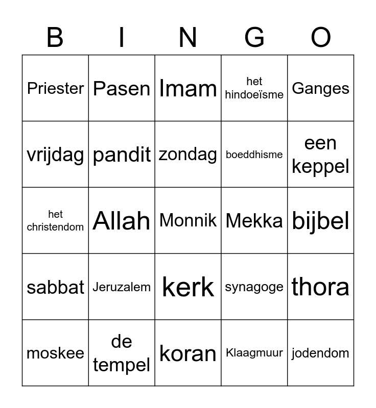 This bingo card has 31 words: koran, Rabbijn, Allah, de islam, Priester, Imam, pandit, synagoge, Mekka, Klaagmuur, bijbel, Monnik, jodendom, Boeddha, een keppel, Mekka, thora, Jeruzalem, sabbat, kerk, Ganges, Rome, moskee, Pasen, boeddhisme, vrijdag, het hindoeïsme, het christendom, de tempel, zondag and tipitaka.