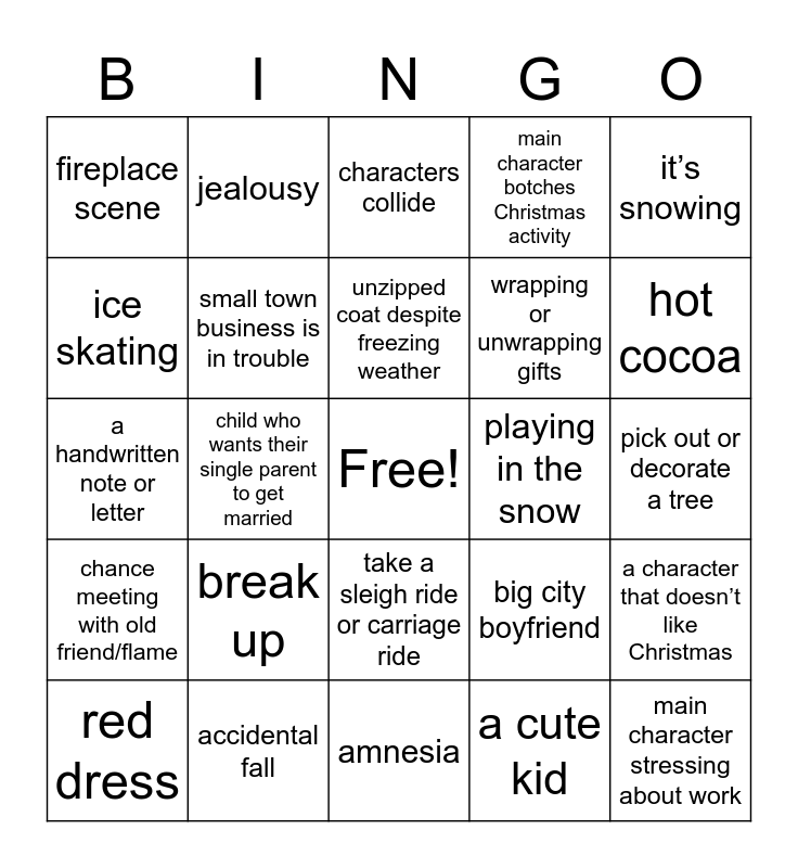 This bingo card has a free space and 51 words: go to small town, main character stressing about work, main characters meet and don’t like each other at first, amnesia, break up, Christmas event, jealousy, crazy side character, ice skating, baking Christmas goodies, small town business is in trouble, main character botches Christmas activity, a character that doesn’t like Christmas, big city boyfriend, mistletoe, almost kiss, unzipped coat despite freezing weather, playing in the snow, wedding dress, it’s snowing, child who wants their single parent to get married, a cute kid, fireplace scene, wrapping or unwrapping gifts, a big misunderstanding, someone wears an apron, hot cocoa, pretend to be in a relationship, red dress, characters collide, someone else has a crush on the love interest, skiing, big Christmas light display, love triangle, someone walking a dog, accidental fall, flashback, someone has a secret identity, holiday inspired character name, town is famous for something Christmas related, pick out or decorate a tree, chance meeting with old friend/flame, live Christmas music, sharing about someone they lost, character is a workaholic, bad weather makes travel impossible, a handwritten note or letter, fancy Christmas party or ball, someone wearing flannel, take a sleigh ride or carriage ride and “Fake Christmas trees are not acceptable!”.