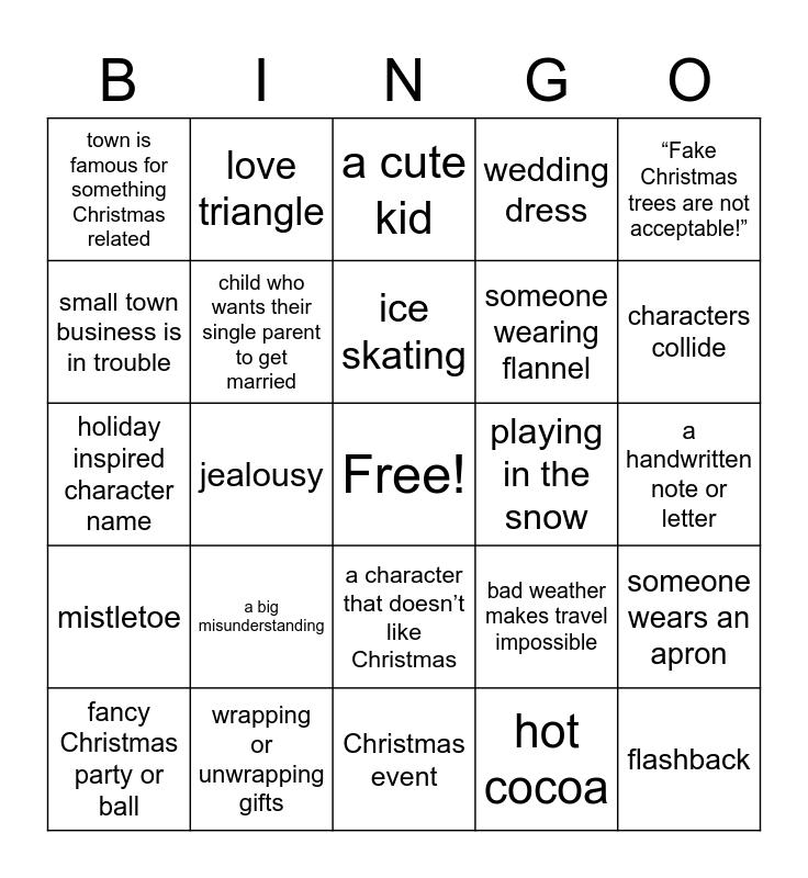 This bingo card has a free space and 51 words: red dress, flashback, main character stressing about work, Christmas event, a big misunderstanding, accidental fall, love triangle, baking Christmas goodies, small town business is in trouble, fireplace scene, child who wants their single parent to get married, wedding dress, someone wears an apron, bad weather makes travel impossible, almost kiss, crazy side character, ice skating, playing in the snow, someone walking a dog, “Fake Christmas trees are not acceptable!”, jealousy, hot cocoa, town is famous for something Christmas related, someone wearing flannel, live Christmas music, main character botches Christmas activity, characters collide, sharing about someone they lost, fancy Christmas party or ball, a cute kid, amnesia, big city boyfriend, character is a workaholic, main characters meet and don’t like each other at first, unzipped coat despite freezing weather, wrapping or unwrapping gifts, big Christmas light display, chance meeting with old friend/flame, take a sleigh ride or carriage ride, break up, a handwritten note or letter, mistletoe, skiing, pick out or decorate a tree, someone has a secret identity, go to small town, holiday inspired character name, it’s snowing, pretend to be in a relationship, a character that doesn’t like Christmas and someone else has a crush on the love interest.