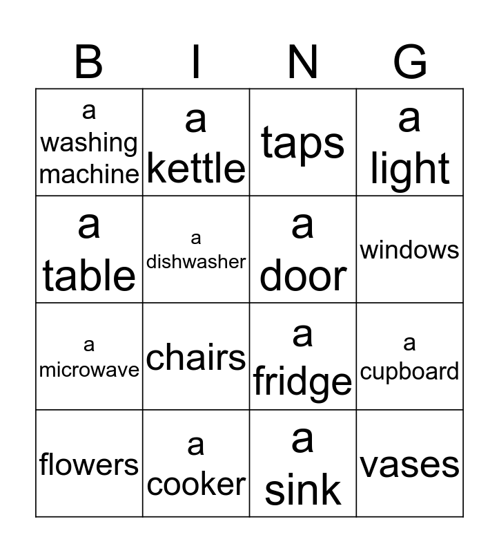 This bingo card has 16 words: a cooker, a cupboard, taps, a washing machine, a microwave, a kettle, a fridge, a sink, a table, a dishwasher, flowers, a light, chairs, windows, a door and vases.