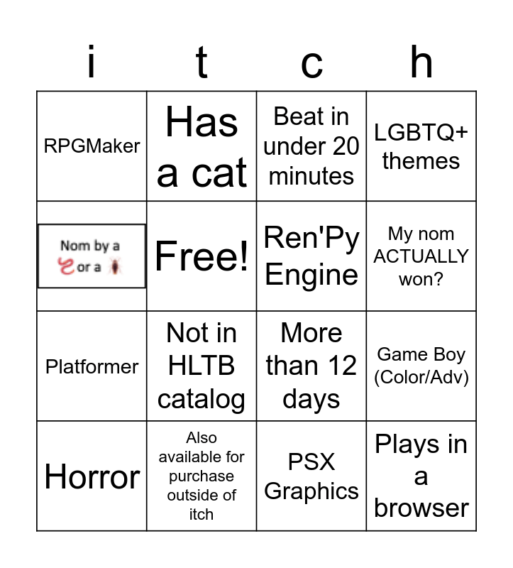 This bingo card has 1 images and 15 words: Also available for purchase outside of itch, Game Boy (Color/Adv), Beat in under 20 minutes, RPGMaker, Platformer, Has a cat, More than 12 days, PSX Graphics, Free!, Horror, LGBTQ+ themes, Not in HLTB catalog, My nom ACTUALLY won?, Ren'Py Engine and Plays in a browser.