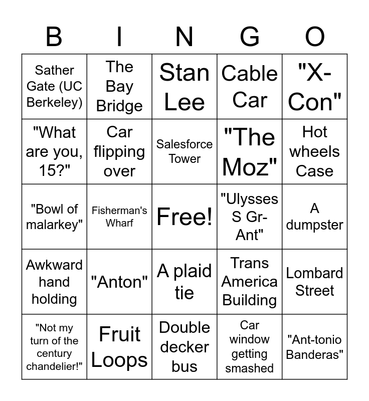 This bingo card has a free space and 24 words: "Anton", Fruit Loops, Salesforce Tower, "Not my turn of the century chandelier!", "X-Con", Sather Gate (UC Berkeley), "What are you, 15?", The Bay Bridge, "Ulysses S Gr-Ant", A plaid tie, "The Moz", "Bowl of malarkey", Trans America Building, Lombard Street, Car flipping over, Car window getting smashed, A dumpster, Stan Lee, Hot wheels Case, Fisherman's Wharf, "Ant-tonio Banderas", Awkward hand holding, Cable Car and Double decker bus.