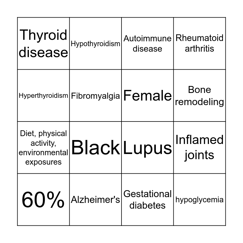 This bingo card has a free space and 15 words: 60%, hypoglycemia, Autoimmune disease, Thyroid disease, Bone remodeling, Hyperthyroidism, Black, Gestational diabetes, Fibromyalgia, Diet, physical activity, environmental exposures, Inflamed joints, Rheumatoid arthritis, Female, Hypothyroidism and Alzheimer's.