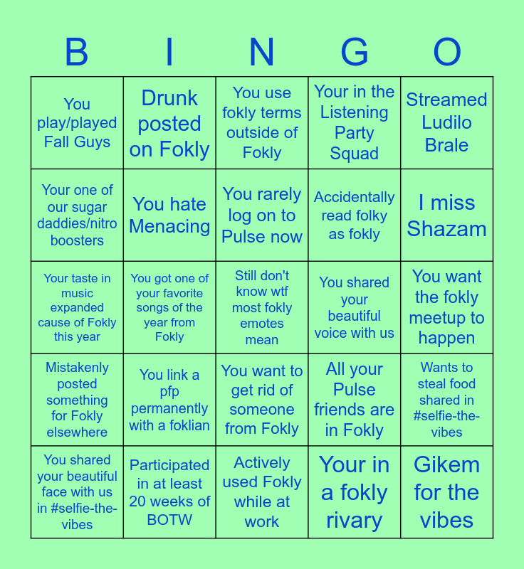 This bingo card has a free space and 24 words: You link a pfp permanently with a foklian, Participated in at least 20 weeks of BOTW, You rarely log on to Pulse now, You shared your beautiful face with us in #selfie-the-vibes, Streamed Ludilo Brale, You play/played Fall Guys, Your one of our sugar daddies/nitro boosters, Drunk posted on Fokly, You shared your beautiful voice with us, You want to get rid of someone from Fokly, Accidentally read folky as fokly, Your taste in music expanded cause of Fokly this year, All your Pulse friends are in Fokly, Wants to steal food shared in #selfie-the-vibes, You hate Menacing, Your in a fokly rivary, You want the fokly meetup to happen, You use fokly terms outside of Fokly, I miss Shazam, You got one of your favorite songs of the year from Fokly, Gikem for the vibes, Mistakenly posted something for Fokly elsewhere, Your in the Listening Party Squad and Actively used Fokly while at work.