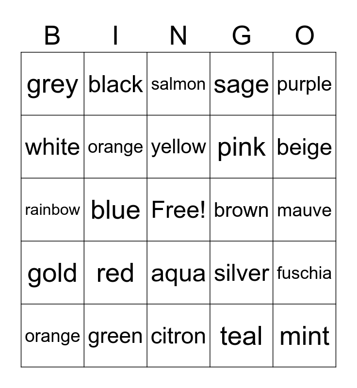 This bingo card has a free space and 24 words: red, green, yellow, orange, purple, grey, white, black, brown, aqua, pink, rainbow, silver, fuschia, orange, teal, mauve, salmon, beige, blue, mint, gold, sage and citron.