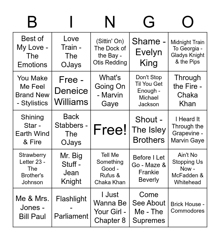 This bingo card has a free space and 25 words: Mr. Big Stuff - Jean Knight, I Just Wanna Be Your Girl - Chapter 8, What's Going On - Marvin Gaye, Me & Mrs. Jones - Bill Paul, Midnight Train To Georgia - Gladys Knight & the Pips, Best of My Love - The Emotions, You Make Me Feel Brand New - Stylistics, Love Train - The OJays, Shout - The Isley Brothers, Tell Me Something Good - Rufus & Chaka Khan, Don't Stop Til You Get Enough - Michael Jackson, Shining Star - Earth Wind & Fire, Before I Let Go - Maze & Frankie Beverly, Ain't No Stopping Us Now - McFadden & Whitehead, Free - Deneice Williams, Build Me Up Buttercup - The Foundations, I Heard It Through the Grapevine - Marvin Gaye, (Sittin' On) The Dock of the Bay - Otis Redding, Through the Fire - Chaka Khan, Back Stabbers - The OJays, Brick House - Commodores, Flashlight - Parliament, Strawberry Letter 23 - The Brother's Johnson, Shame - Evelyn King and Come See About Me - The Supremes.