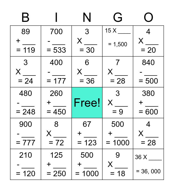 This bingo card has a free space and 24 words: 8 X ___ = 72, 125 + ___ = 250, 6 X ___ = 36, 210 - ___ = 120, 4 X ___ = 20, 89 + ___ = 119, 3 X ___ = 24, 700 - ___ = 533, 3 X ___ = 9, 67 + ___ = 123, 7 X ___ = 28, 480 - ___ = 248, 500 + ___ = 1000, 4 X ___ = 28, 400 - ___ = 177, 9 X ___ = 18, 380 + ___ = 600, 3 X ___ = 30, 840 - ___ = 500, 260 + ___ = 450, 36 X ____ = 36, 000, 900 - ___ = 777, 15 X ____ = 1,500 and 500 + ___ = 1000.