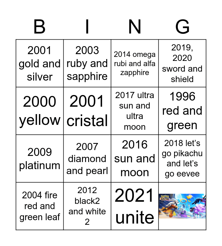 This bingo card has 1 images and 22 words: Free!, 1996 red and green, 1999 red and blue, 2000 yellow, 2001 gold and silver, 2001 cristal, 2003 ruby and sapphire, 2004 fire red and green leaf, 2005 emerald, 2007 diamond and pearl, 2009 platinum, 2010 heartgold and soulsilver, 2011 black and white, 2012 black2 and white 2, 2013 x and y, 2014 omega rubi and alfa zapphire, 2016 sun and moon, 2017 ultra sun and ultra moon, 2018 let’s go pikachu and let’s go eevee, 2019, 2020 sword and shield, 2021 unite and 2022 scarlet and violet.