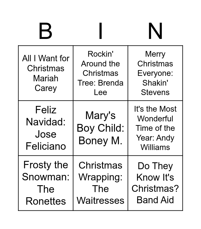 This bingo card has 20 words: Free!, Last Christmas: Wham!, Merry Christmas Everyone: Shakin' Stevens, I Wish it Could be Christmas Every Day: Wizzard, Step into Christmas: Elton John, Mary's Boy Child: Boney M., Santa Claus is Coming to Town: The Jackson 5, All I Want for Christmas Mariah Carey, Do They Know It's Christmas? Band Aid, Rockin' Around the Christmas Tree: Brenda Lee, Fairytale of New York: The Pogues, Wonderful Christmastime: Paul McCartney, It's the Most Wonderful Time of the Year: Andy Williams, Let it Snow! Frank Sinatra, Frosty the Snowman: The Ronettes, Merry Christmas Everybody: Slade, Christmas Wrapping: The Waitresses, Feliz Navidad: Jose Feliciano, Jingle Bell Rock: Bobby Helms and Driving Home for Christmas: Chris Rea.