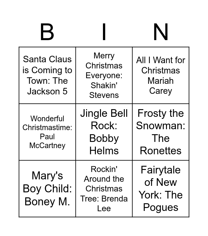 This bingo card has 21 words: Free!, Last Christmas: Wham!, Merry Christmas Everyone: Shakin' Stevens, I Wish it Could be Christmas Every Day: Wizzard, Step into Christmas: Elton John, Mary's Boy Child: Boney M., Santa Claus is Coming to Town: The Jackson 5, All I Want for Christmas Mariah Carey, Do They Know It's Christmas? Band Aid, Rockin' Around the Christmas Tree: Brenda Lee, Fairytale of New York: The Pogues, Wonderful Christmastime: Paul McCartney, It's the Most Wonderful Time of the Year: Andy Williams, Let it Snow! Frank Sinatra, Frosty the Snowman: The Ronettes, Merry Christmas Everybody: Slade, Christmas Wrapping: The Waitresses, Feliz Navidad: Jose Feliciano, Jingle Bell Rock: Bobby Helms, Driving Home for Christmas: Chris Rea and Stop the Cavalry: Jona Lewie.