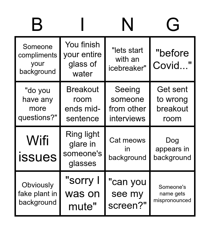 This bingo card has 16 words: "sorry I was on mute", Dog appears in background, "lets start with an icebreaker", Someone compliments your background, Wifi issues, You finish your entire glass of water, Cat meows in background, "can you see my screen?", "do you have any more questions?", Breakout room ends mid-sentence, Obviously fake plant in background, "before Covid...", Ring light glare in someone's glasses, Get sent to wrong breakout room, Seeing someone from other interviews and Someone's name gets mispronounced.