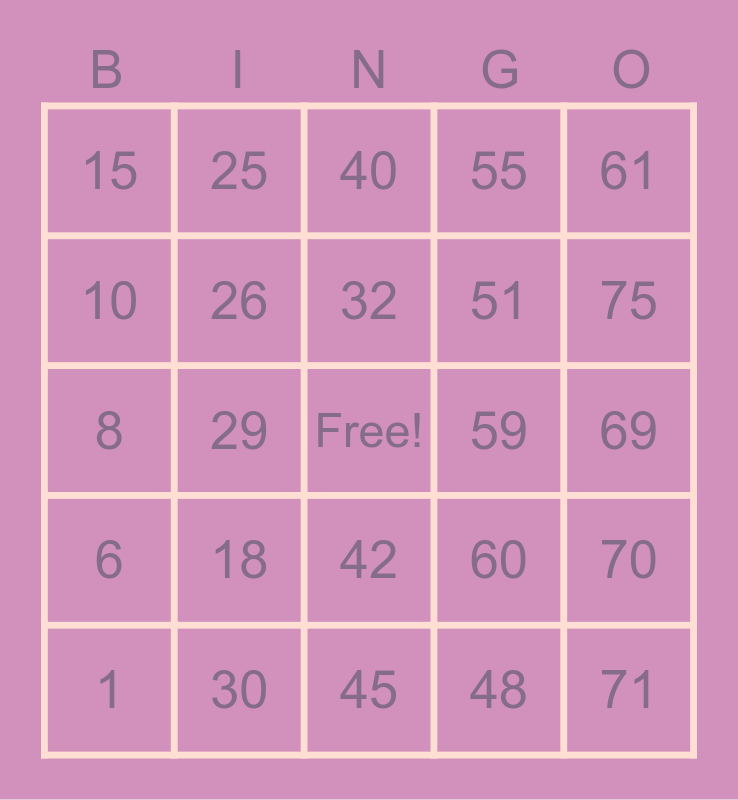 This bingo card has a free space and 24 words: 1, 18, 32, 48, 61, 15, 25, 40, 59, 69, 8, 26, 60, 70, 10, 30, 45, 55, 75, 6, 29, 42, 51 and 71.