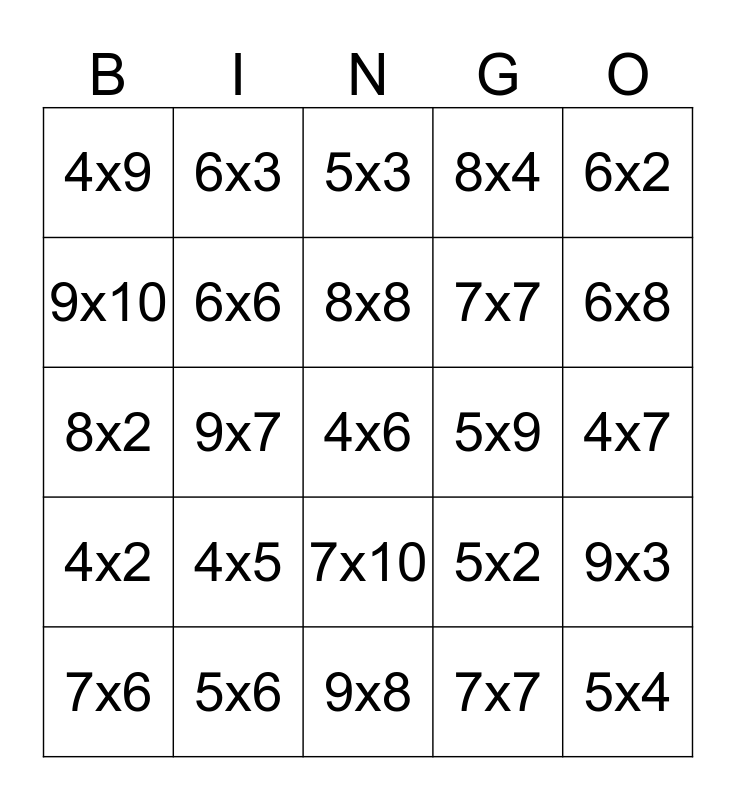This bingo card has a free space and 24 words: 4x5, 5x6, 8x8, 7x6, 6x2, 4x9, 9x10, 6x3, 5x9, 7x10, 7x7, 8x2, 5x2, 9x3, 6x6, 7x7, 4x7, 5x3, 6x8, 9x7, 5x4, 4x2, 8x4 and 9x8.