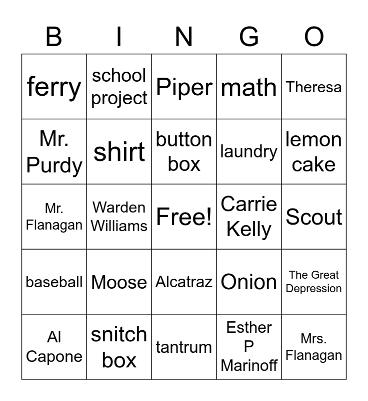 This bingo card has a free space and 24 words: Moose, snitch box, button box, Al Capone, Theresa, ferry, Mr. Purdy, school project, Carrie Kelly, Alcatraz, laundry, Mr. Flanagan, Onion, The Great Depression, shirt, Esther P Marinoff, Scout, Piper, lemon cake, Warden Williams, Mrs. Flanagan, baseball, math and tantrum.