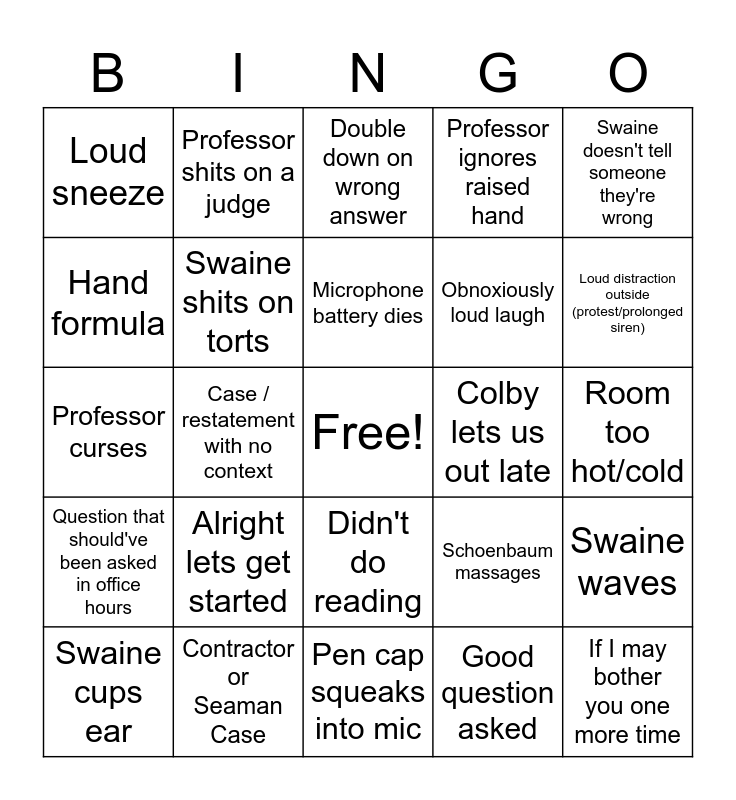 This bingo card has a free space and 24 words: Alright lets get started, Contractor or Seaman Case, Microphone battery dies, Swaine cups ear, Swaine doesn't tell someone they're wrong, Loud sneeze, Hand formula, Professor shits on a judge, Colby lets us out late, Didn't do reading, Obnoxiously loud laugh, Professor curses, Schoenbaum massages, Swaine waves, Swaine shits on torts, Good question asked, Room too hot/cold, Double down on wrong answer, Loud distraction outside (protest/prolonged siren), Case / restatement with no context, If I may bother you one more time, Question that should've been asked in office hours, Professor ignores raised hand and Pen cap squeaks into mic.