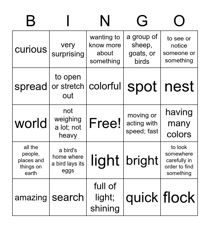This bingo card has a free space and 24 words: a bird's home where a bird lays its eggs, search, colorful, amazing, to see or notice someone or something, curious, spread, very surprising, moving or acting with speed; fast, light, spot, world, bright, to look somewhere carefully in order to find something, to open or stretch out, quick, having many colors, wanting to know more about something, nest, not weighing a lot; not heavy, flock, all the people, places and things on earth, a group of sheep, goats, or birds and full of light; shining.
