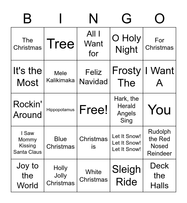 This bingo card has a free space and 42 words: Last Christmas, Feliz Navidad, Carol of the Bells, Blue Christmas, Sleigh Ride, Rudolph the Red Nosed Reindeer, Deck the Halls, Santa Baby, All I Want for, Christmas is, You, I Want A, Hippopotamus, For Christmas, Drummer Boy, Let It Snow! Let It Snow! Let It Snow!, Santa Tell Me, Rockin' Around, the Christmas, Tree, It's the Most, Wonderful Time, of the Year, The Christmas, Song, Silent Night, Frosty The, Snowman, Here Comes, Santa Claus, Winter Wonderland, I Saw Mommy Kissing Santa Claus, Mele Kalikimaka, White Christmas, The Chipmunk Song, Joy to the World, Holly Jolly Christmas, Hark, the Herald Angels Sing, What Child Is This?, O Tannenbaum (Christmas Tree, Oh Christmas Tree), O Holy Night and Mary, Did You Know?.