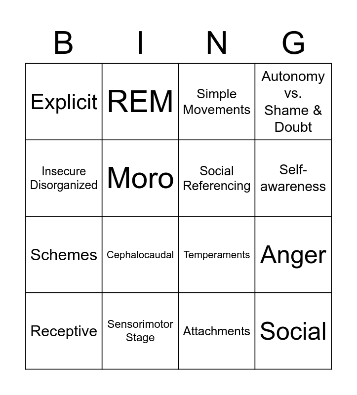 This bingo card has 16 words: Sensorimotor Stage, Anger, Simple Movements, Explicit, Schemes, REM, Temperaments, Attachments, Insecure Disorganized, Moro, Receptive, Autonomy vs. Shame & Doubt, Cephalocaudal, Self-awareness, Social Referencing and Social.
