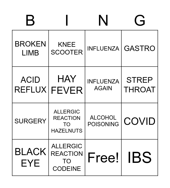 This bingo card has 17 words: Free!, BLACK EYE, INFLUENZA, BROKEN LIMB, ALLERGIC REACTION TO HAZELNUTS, GASTRO, COVID, INFLUENZA AGAIN, STREP THROAT, HAY FEVER, ALLERGIC REACTION TO CODEINE, ALCOHOL POISONING, ACID REFLUX, KNEE SCOOTER, SURGERY, PIERCING INFECTION and IBS.
