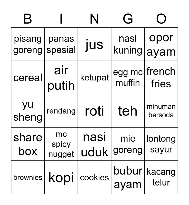 This bingo card has a free space and 24 words: mc spicy nugget, kopi, ketupat, brownies, opor ayam, pisang goreng, cereal, panas spesial, teh, nasi uduk, egg mc muffin, yu sheng, mie goreng, lontong sayur, air putih, bubur ayam, minuman bersoda, jus, french fries, rendang, kacang telur, share box, nasi kuning and cookies.