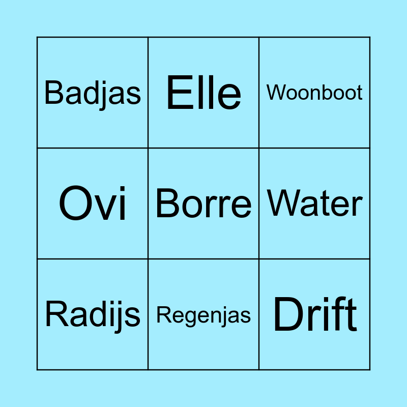 This bingo card has 10 words: Regenjas, Woonboot, Badjas, Borre, Ovi, Radijs, Elle, Storm, Water and Drift.