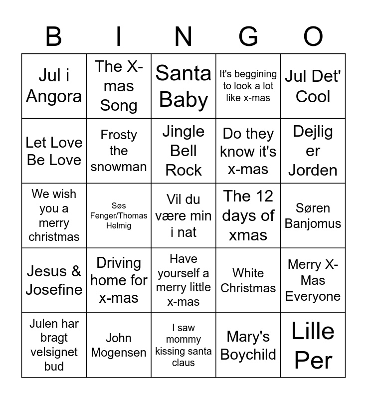 This bingo card has 64 words: Mariah Carey, It's the most wonderful time of the year, Let it snow! Let it snow! Let it snow!, Merry X-Mas Everyone, Winter Wonderland, Baby It's Cold Outside, The X-mas Song, It's Gona Be A Cold Cold X-mas, Jingle Bell Rock, Rocking around the x-mas tree, Have yourself a merry little x-mas, Silent Night, Søren Banjomus, Jul Det' Cool, Søs Fenger/Thomas Helmig, Let Love Be Love, Søs Fenger/Thomas Helmig, Jul i Angora, John Lenon/Yoko Ono, Do they know it's x-mas, Driving home for x-mas, Jesus & Josefine, It's beggining to look a lot like x-mas, Mistletoe, Queen, Gasolin, Merry X-Mas Everybody, It's hard to be a Nissemand, Wham!, Sleigh Ride, Feliz Navidad, Little Drummerboy, Barn Jesus i en krybe lå, Hjerte, Løft din glædes vinger, Dejlig er Jorden, Julen har bragt velsignet bud, Der er ingenting i Verden.., Mary's Boychild, Rudolf the red nose raindeer, Frosty the snowman, We wish you a merry christmas, The 12 days of xmas, Deck the halls, Jingle Bells, Blue Christmas, Vil du være min i nat, John Mogensen, Lille Per, White Christmas, Merry Christmas, Santa Claus is coming to town, Ave Maria, I saw mommy kissing santa claus, I want Elvis for Xmas, O come All Yee Faithfull, Hark! The Herald angels sing, Santa Baby, Vinterbyøster, Nu tændes tusind julelys, Pyrus, Jul på slottet, Nissebanden, Bjældeklang and Santa Tell Me.
