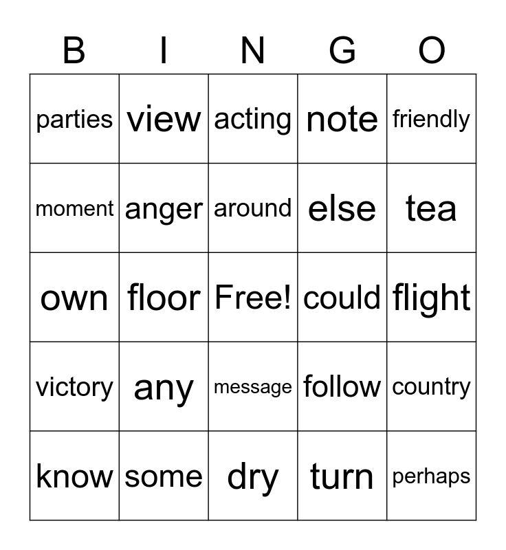 This bingo card has a free space and 24 words: any, some, around, know, friendly, parties, moment, view, could, message, else, own, follow, country, anger, turn, flight, acting, tea, floor, perhaps, victory, note and dry.