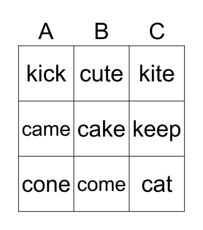 This bingo card has 9 words: cone, kite, cute, came, kick, keep, cake, cat and come.