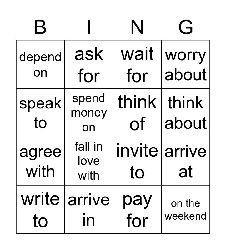 This bingo card has 16 words: arrive in, arrive at, wait for, depend on, agree with, ask for, invite to, pay for, speak to, spend money on, write to, worry about, fall in love with, think about, think of and on the weekend.