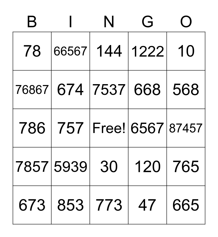 This bingo card has a free space and 24 words: 5939, 853, 7537, 673, 10, 78, 76867, 66567, 6567, 30, 668, 786, 120, 765, 674, 47, 87457, 144, 568, 757, 665, 7857, 1222 and 773.