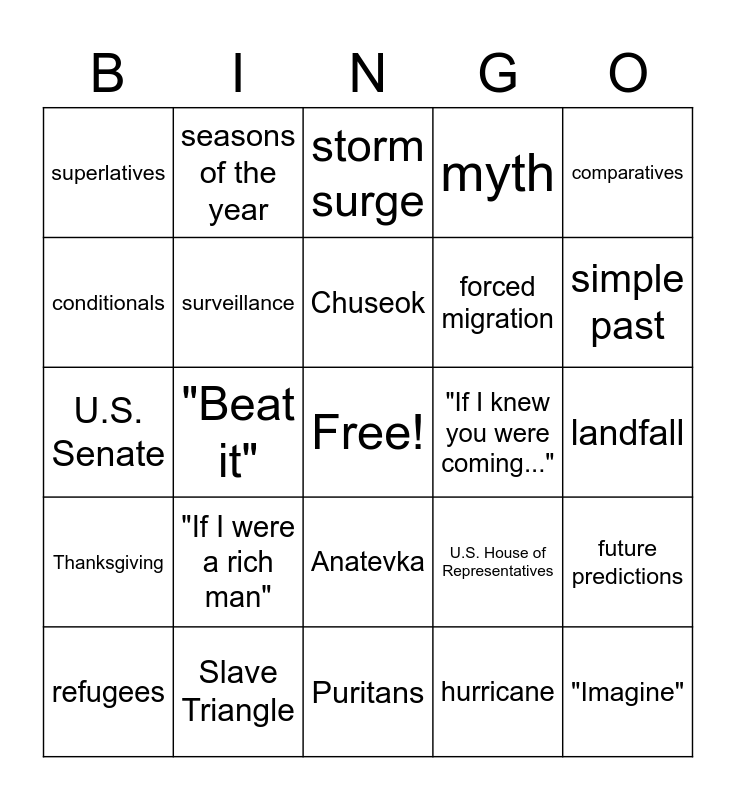 This bingo card has a free space and 24 words: "If I were a rich man", Slave Triangle, Chuseok, refugees, comparatives, superlatives, conditionals, seasons of the year, "If I knew you were coming...", Anatevka, forced migration, U.S. Senate, U.S. House of Representatives, future predictions, surveillance, hurricane, landfall, storm surge, simple past, "Beat it", "Imagine", Thanksgiving, myth and Puritans.