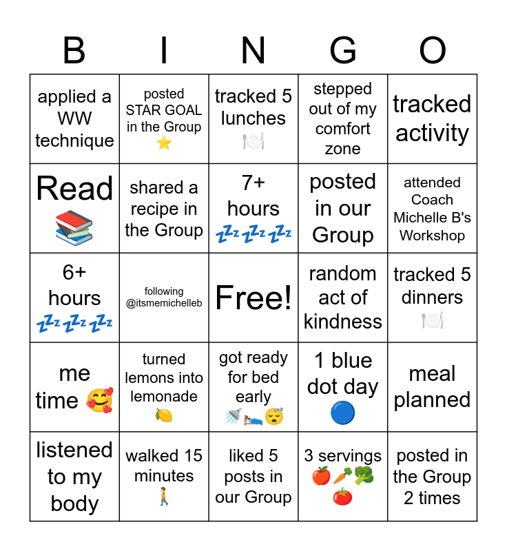 This bingo card has a free space and 26 words: got ready for bed early πΏππ΄, 3 servings ππ₯π₯¦π , 7+ hours π€π€π€, walked 15 minutes πΆ, tracked activity, applied a WW technique, Read π, posted STAR GOAL in the Group β, tracked 5 dinners π½οΈ, 1 blue dot day π΅, posted in our Group, 6+ hours π€π€π€, meal planned, listened to my body, following @itsmemichelleb, danced ππΊπ©°, stepped out of my comfort zone, me time π₯°, tracked 5 lunches π½οΈ, posted in the Group 2 times, attended Coach Michelle B's Workshop, liked 5 posts in our Group, random act of kindness, turned lemons into lemonade π, shared a recipe in the Group and posted one day of my food tracker.