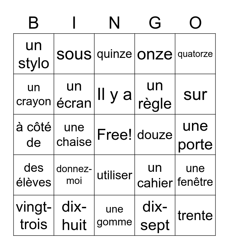 This bingo card has a free space and 44 words: vingt, trente, vingt et un, vingt-trois, vingt-neuf, dix-sept, quinze, treize, quatorze, dix-huit, onze, douze, utiliser, donnez-moi, un taille-crayon, une gomme, une horloge, à côté de, dans, sur, sous, J'ai besoin de, un feutre, un stylo, une carte, une porte, une affiche, un classeur, un cahier, des élèves, la salle de classe, une fenêtre, une prof, un tableau, une chaise, un ordinateur, une feuille de papier, un sac à dos, Il y a, un crayon, un règle, un bureau, un écran and écrire.