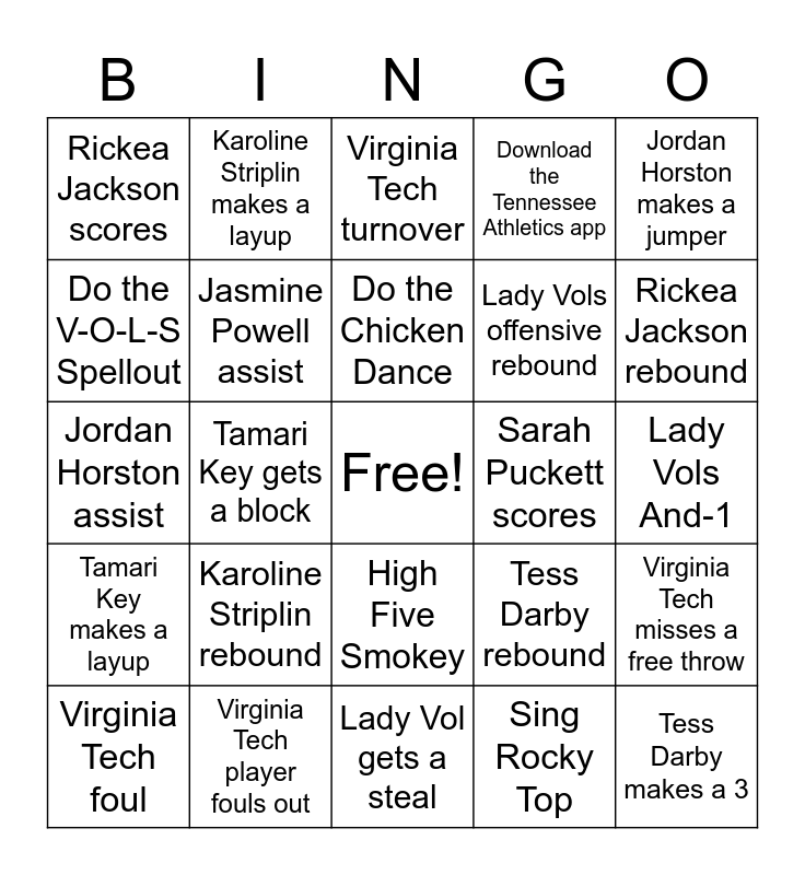 This bingo card has a free space and 35 words: Jillian Hollingshead scores, Jillian Hollingshead gets a block, Jasmine Powell makes a 3, Jasmine Powell assist, High Five Smokey, Download the Tennessee Athletics app, Do the V-O-L-S Spellout, Do the Lady Vols chant, Do the Chicken Dance, Catch a T-Shirt, Jordan Horston assist, Jordan Horston makes a jumper, Jordan Horston rebound, Jordan Walker makes a jumper, Rickea Jackson scores, Sarah Puckett scores, Sing Rocky Top, Tamari Key gets a block, Tamari Key makes a layup, Tess Darby makes a 3, Tess Darby rebound, Virginia Tech foul, Virginia Tech misses a free throw, Virginia Tech player fouls out, Virginia Tech turnover, Rickea Jackson rebound, Rickea Jackson makes a 3, Marta Suarez made 3, Lady Vols offensive rebound, Lady Vols And-1, Lady Vol makes two free throws in a row, Lady Vol gets a steal, Karoline Striplin rebound, Karoline Striplin makes a layup and Jordan Walker assist.