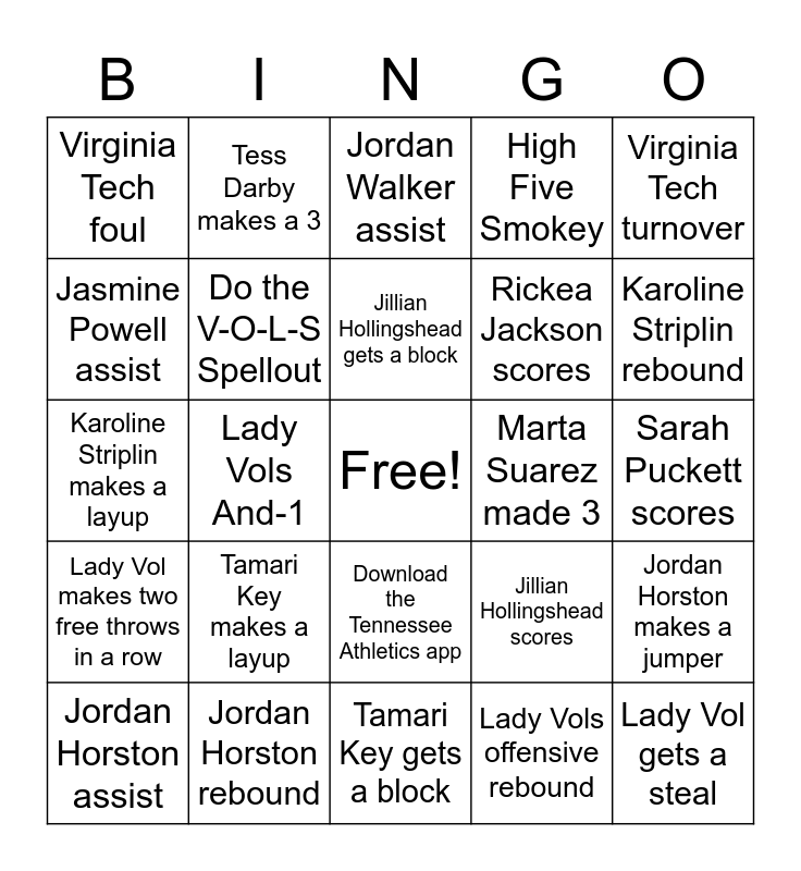 This bingo card has a free space and 35 words: Catch a T-Shirt, Do the Chicken Dance, Do the Lady Vols chant, Do the V-O-L-S Spellout, Download the Tennessee Athletics app, High Five Smokey, Jasmine Powell assist, Jasmine Powell makes a 3, Jillian Hollingshead gets a block, Jordan Walker makes a jumper, Karoline Striplin makes a layup, Virginia Tech turnover, Virginia Tech player fouls out, Virginia Tech misses a free throw, Virginia Tech foul, Marta Suarez made 3, Lady Vols offensive rebound, Lady Vols And-1, Lady Vol makes two free throws in a row, Lady Vol gets a steal, Jillian Hollingshead scores, Jordan Horston assist, Jordan Horston makes a jumper, Jordan Horston rebound, Jordan Walker assist, Karoline Striplin rebound, Rickea Jackson makes a 3, Rickea Jackson rebound, Rickea Jackson scores, Sarah Puckett scores, Sing Rocky Top, Tamari Key gets a block, Tamari Key makes a layup, Tess Darby makes a 3 and Tess Darby rebound.