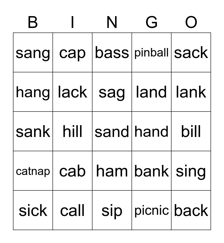 This bingo card has 25 words: cab, sip, sag, sick, sack, sang, hang, cap, hand, ham, land, sank, bank, sing, lack, back, bill, bass, lank, hill, sand, call, catnap, pinball and picnic.