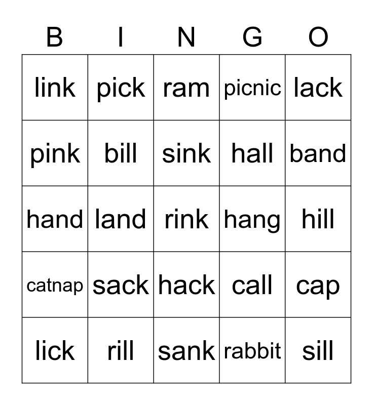 This bingo card has 25 words: sack, sank, sink, lick, lack, link, pink, pick, hang, hack, hall, hand, call, cap, bill, sill, hill, ram, band, land, rink, rill, catnap, picnic and rabbit.