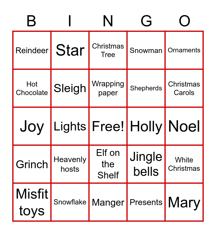 This bingo card has a free space and 47 words: Baby Jesus, Mary, Joseph, Manger, Heavenly hosts, Angels, Star, Wisemen, Hot Chocolate, Hymns, Sleigh, Snowman, White Christmas, Jingle bells, Wreath, Ribbons and Bows, Wrapping paper, Holly, Mistletoe, Ornaments, Lights, Presents, Reindeer, Shepherds, Candy Cane, Christmas Carols, Misfit toys, Yukon Cornelius, Elf on the Shelf, Grinch, Rudolph, Silent Night, Bumble, Candle, Stocking, Snowflake, Noel, Fireplace, Santa, Holiday, Sugar Cookies, Christmas Tree, Joy, Merry Christmas, North Pole, Greeting Cards and Tinsel.