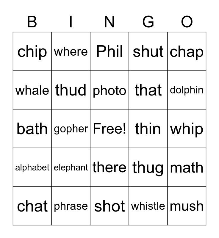This bingo card has a free space and 24 words: elephant, phrase, photo, chat, chap, chip, whale, where, thin, there, that, bath, thug, math, thud, whistle, whip, Phil, dolphin, gopher, mush, alphabet, shut and shot.