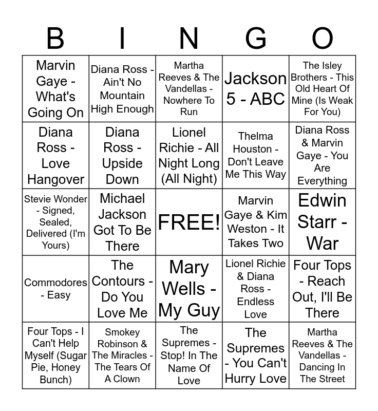This bingo card has a free space and 44 words: Marvin Gaye - I Heard It Through The Grapevine, Martha Reeves & The Vandellas - Dancing In The Street, The Supremes - Baby Love, Four Tops - I Can't Help Myself (Sugar Pie, Honey Bunch), The Temptations - Get Ready, The Supremes - You Can't Hurry Love, Martha Reeves & The Vandellas - Nowhere To Run, Martha Reeves & The Vandellas - Jimmy Mack, The Isley Brothers - This Old Heart Of Mine (Is Weak For You), Smokey Robinson & The Miracles - The Tears Of A Clown, Jackson 5 - ABC, Marvin Gaye & Kim Weston - It Takes Two, Mary Wells - My Guy, The Contours - Do You Love Me, R. Dean Taylor - There's A Ghost In My House, The Supremes - Stop! In The Name Of Love, Jr. Walker & The All Stars - Shotgun, Stevie Wonder - Signed, Sealed, Delivered (I'm Yours), Jackson 5 - I Want You Back, Diana Ross & Marvin Gaye - You Are Everything, Diana Ross - Ain't No Mountain High Enough, Stevie Wonder - Superstition, The Temptations - Papa Was A Rollin' Stone, Marvin Gaye - What's Going On, Commodores - Brick House, Edwin Starr - War, The Temptations - My Girl, Smokey Robinson & The Miracles - The Tracks Of My Tears, Lionel Richie & Diana Ross - Endless Love, Commodores - Easy, Diana Ross & The Supremes - Reflections, Four Tops - Reach Out, I'll Be There, Marvin Gaye - Let's Get It On, Jimmy Ruffin - What Becomes Of The Brokenhearted, Michael Jackson Got To Be There, Smokey Robinson - Being With You, Stevie Wonder - Sir Duke, The Miracles - Love Machine, Lionel Richie - All Night Long (All Night), Diana Ross - Love Hangover, Thelma Houston - Don't Leave Me This Way, Commodores - Nightshift, Diana Ross - Upside Down and Rick James - Super Freak.