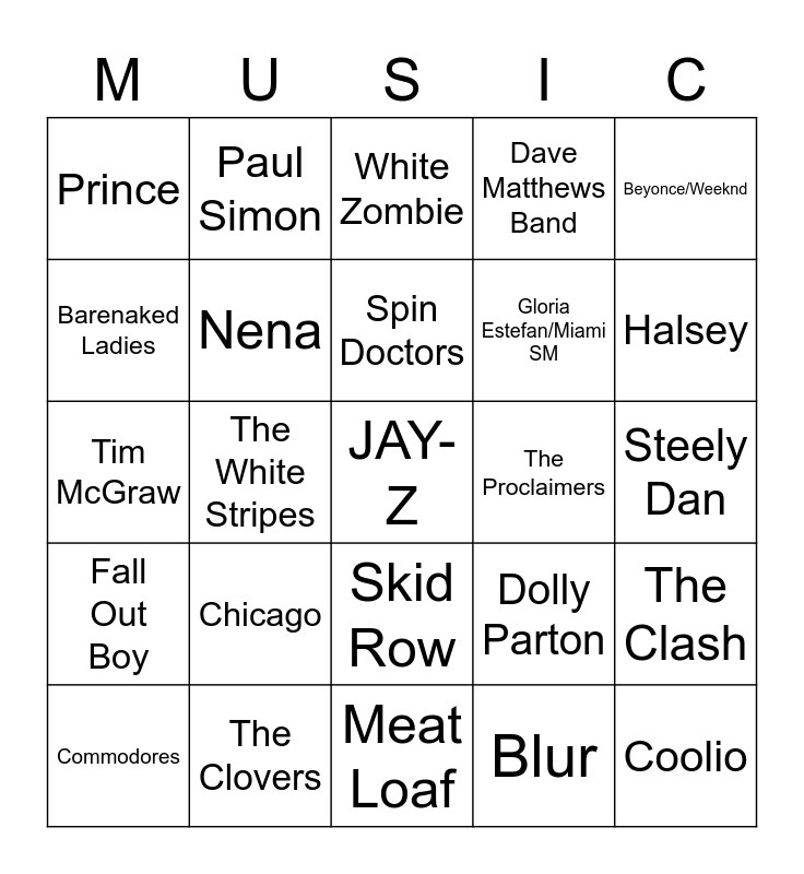 This bingo card has 50 words: Free!, JAY-Z, Bryan Adams, Meat Loaf, Chicago, Metallica, Paul Simon, The Beatles, Barenaked Ladies, U2, Nena, Dave Matthews Band, The Clash, Dolly Parton, Matchbox Twenty, Bob Marley/Wailers, Spin Doctors, The Proclaimers, Tommy Tutone, Beyonce/Weeknd, The White Stripes, Blur, Prince, Gloria Estefan/Miami SM, Phoenix, Coolio, Halsey, Sammy Hager, White Zombie, Skid Row, Eddie Money, The Smashing Pumpkins, MC Hammer, Daft Punk, The Clovers, George Thurgood/Destroyers, Britney Spears, Iron Maiden, Blondie, Steely Dan, The Wallflowers, Eagles, Maroon 5, Bruce Springsteen, Commodores, Tim McGraw, Stevie Nicks, Yeah Yeah Yeahs, Fall Out Boy and Lou Bega.