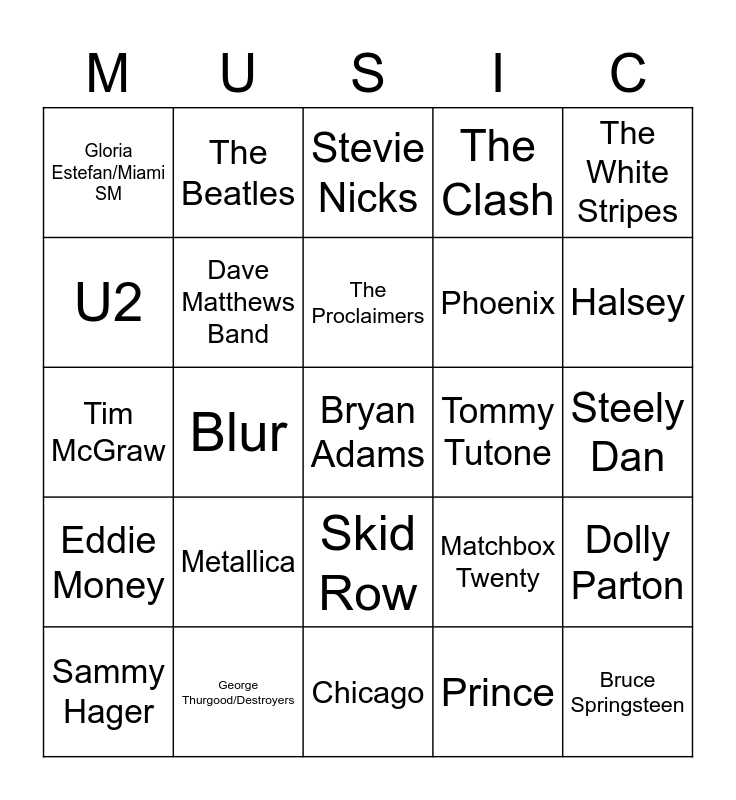 This bingo card has 49 words: JAY-Z, Bryan Adams, Meat Loaf, Chicago, Metallica, Paul Simon, The Beatles, Barenaked Ladies, U2, Nena, Dave Matthews Band, The Clash, Dolly Parton, Matchbox Twenty, Bob Marley/Wailers, Spin Doctors, The Proclaimers, Tommy Tutone, Beyonce/Weeknd, The White Stripes, Blur, Prince, Gloria Estefan/Miami SM, Phoenix, Coolio, Halsey, Sammy Hager, White Zombie, Skid Row, Eddie Money, The Smashing Pumpkins, MC Hammer, Daft Punk, The Clovers, George Thurgood/Destroyers, Britney Spears, Iron Maiden, Blondie, Steely Dan, The Wallflowers, Eagles, Maroon 5, Bruce Springsteen, Commodores, Tim McGraw, Stevie Nicks, Yeah Yeah Yeahs, Fall Out Boy and Lou Bega.