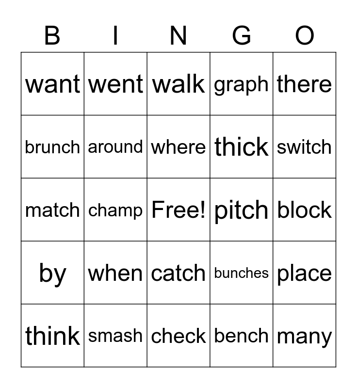 This bingo card has a free space and 24 words: when, smash, where, think, there, want, brunch, went, pitch, catch, thick, match, bunches, place, around, bench, block, walk, switch, champ, many, by, graph and check.